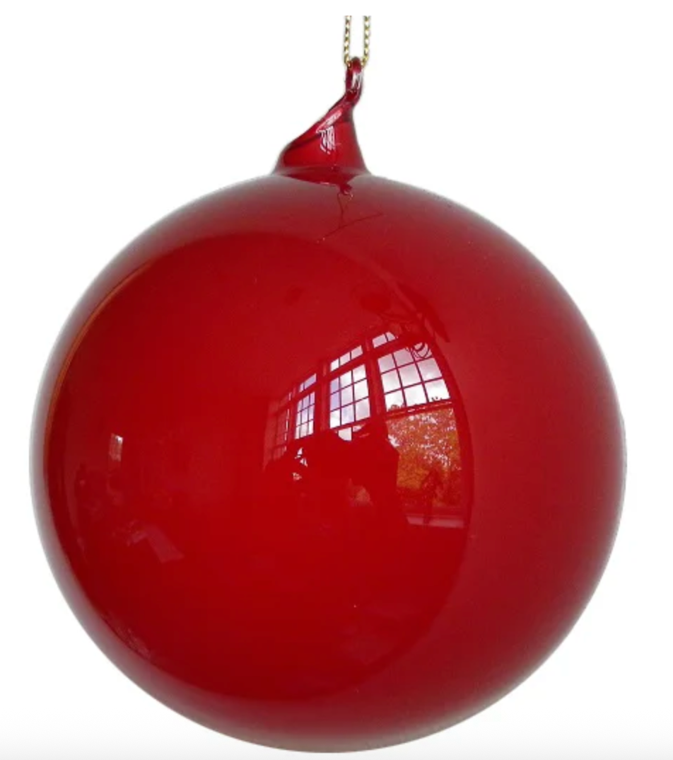 Add bold holiday brilliance with the 150mm Red Bubblegum Glass Ball from Jim Marvin’s iconic ornament collection. Handcrafted from fine glass, this oversized ornament features the designer’s signature “bubblegum” finish—a flawless, glossy sheen that reflects light with luminous depth. Its vivid red hue brings warmth and energy to trees, garlands, and displays, making it a striking accent for both traditional and modern holiday palettes.