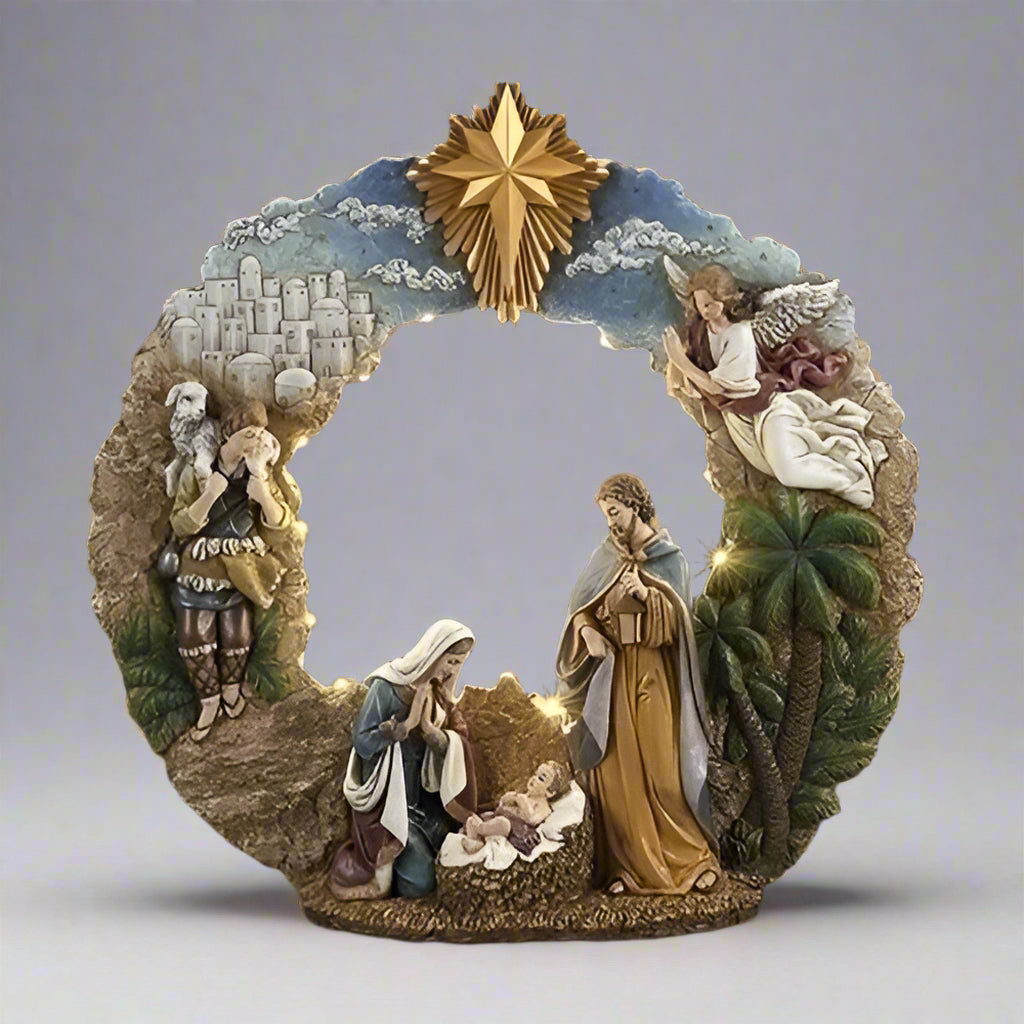 The gentle light enhances the intricate details, making this wreath a perfect piece for mantels, entryways, or walls. Both decorative and devotional, it’s a timeless accent that combines holiday beauty with the sacred story of Christmas.