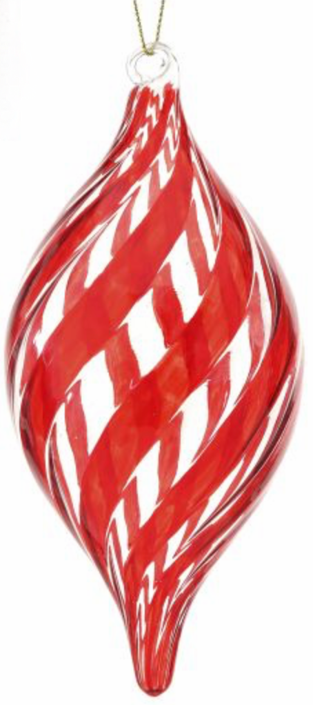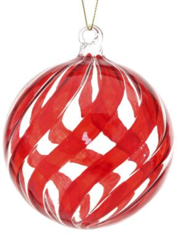 Add a sweet, candy-cane inspired touch to your holiday décor with this hand-blown glass ornament. Clear glass is accented with bold red swirl stripes, creating a festive look that sparkles beautifully on the tree. Available in either a classic ball or elegant finial shape, each piece is sold separately so you can mix and match to suit your style.