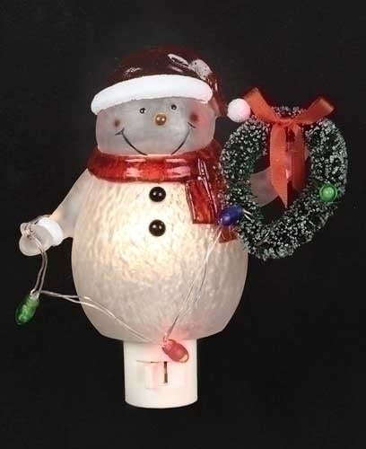 Brighten your holiday décor with this festive Snowman with Wreath Nightlight. Standing 6.5" tall, it features a cheerful snowman holding a holiday wreath, wrapped in a strand of multicolor blinking lights. When illuminated, the playful lights dance with color, adding sparkle and seasonal joy to any space.