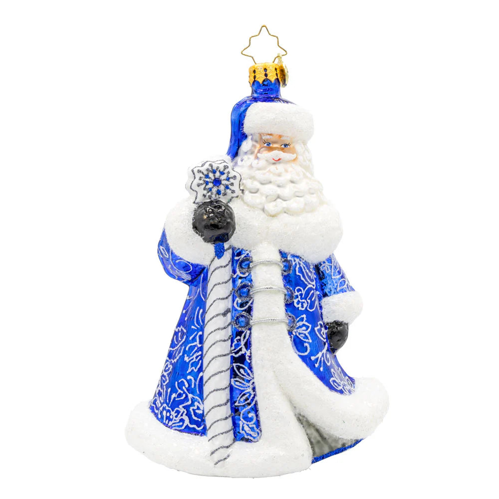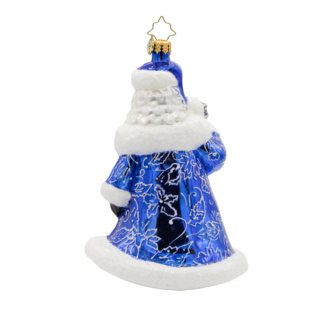 The Chinoiserie Santa Charm by Christopher Radko is a 2025 ornament that blends Eastern-inspired design with traditional holiday cheer. Dressed in a luxurious blue satin gown adorned with intricate floral patterns, silver glitter ties, and deep blue gems, this elegant Santa embodies the charm of Chinoiserie art. Handcrafted in Europe, the ornament measures 7 inches in height, 4.5 inches in length, and 5 inches in width. Its regal appearance makes it a standout piece in any holiday collection.