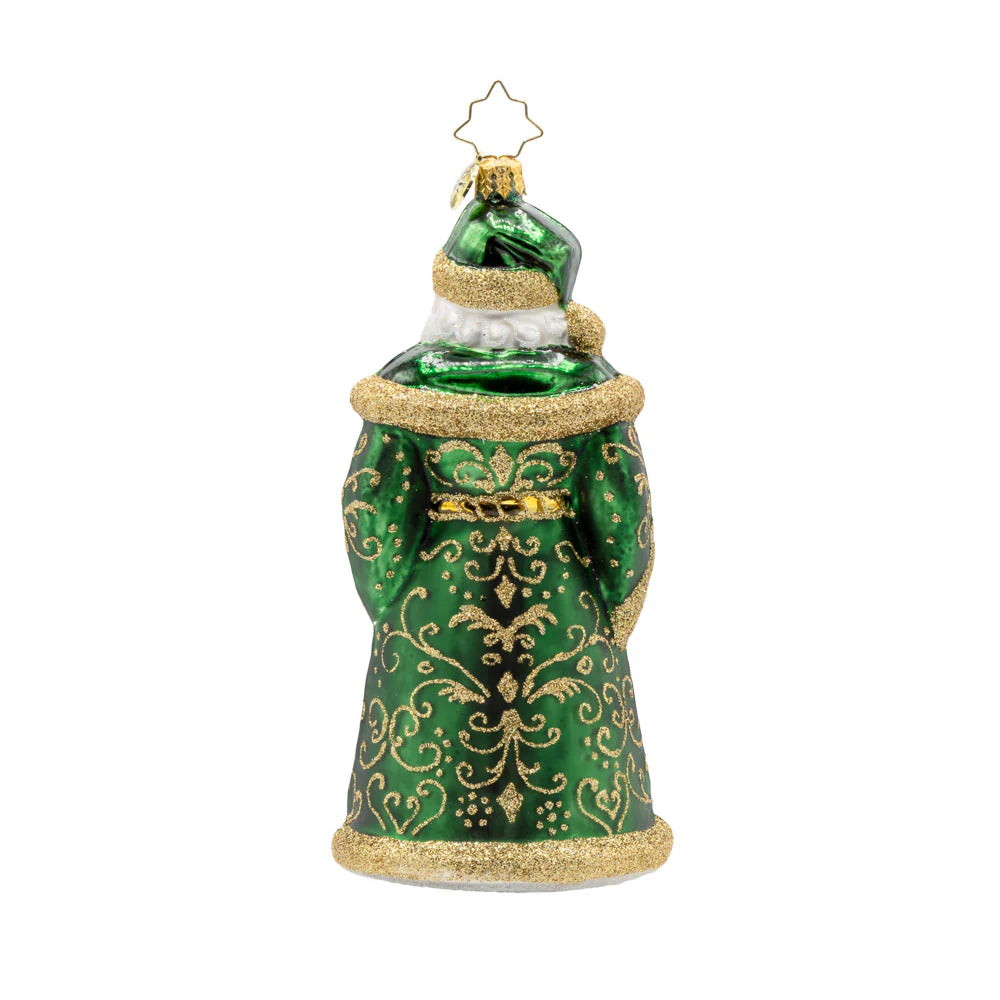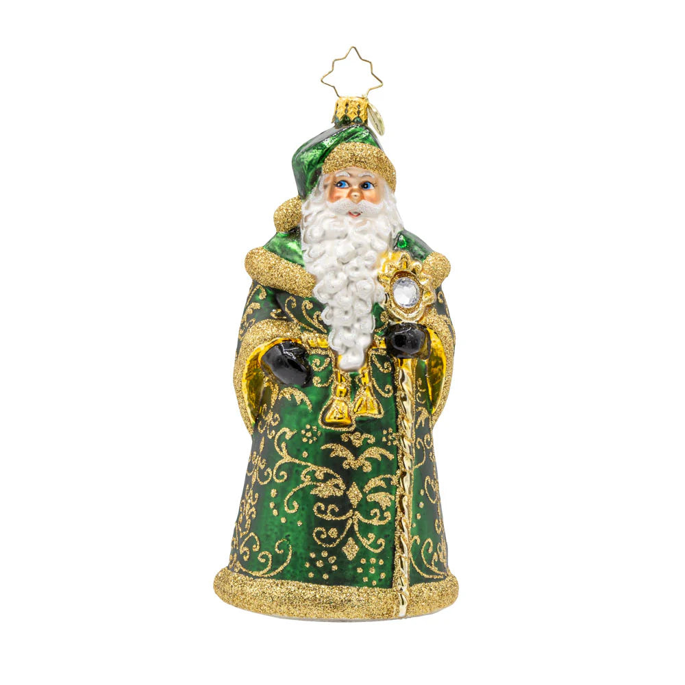 The Emerald Elegance ornament by Christopher Radko is a 2025 addition to the brand's fine European glass collection.This exquisite piece features Santa Claus in a rich emerald green robe, adorned with gold accents and sparkling details.He holds a glittering staff, exuding a regal and festive charm. Handcrafted in Europe, this ornament measures 6.5 inches in height, 3.25 inches in length, and 3 inches in width. Its elegant design makes it a standout addition to any holiday collection.