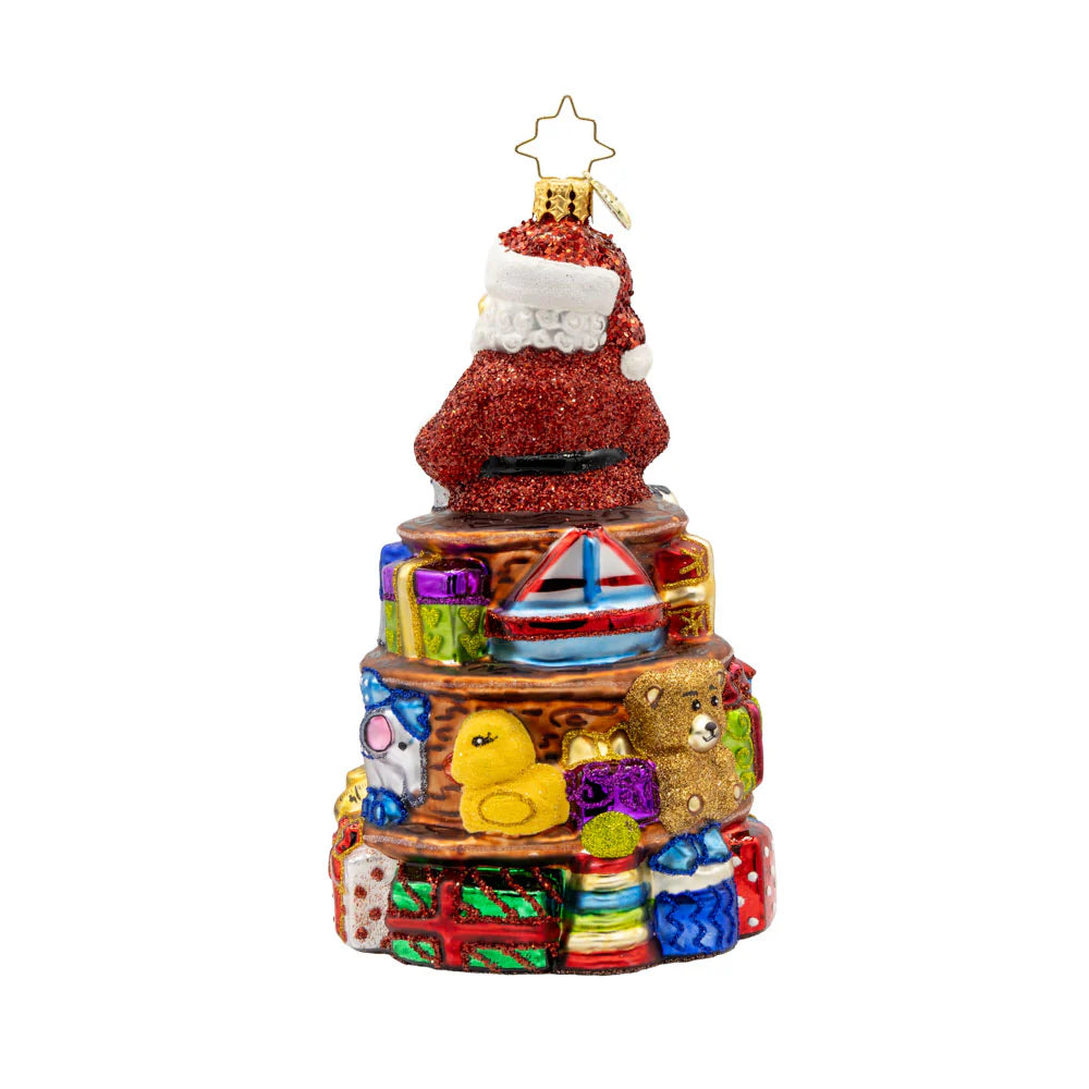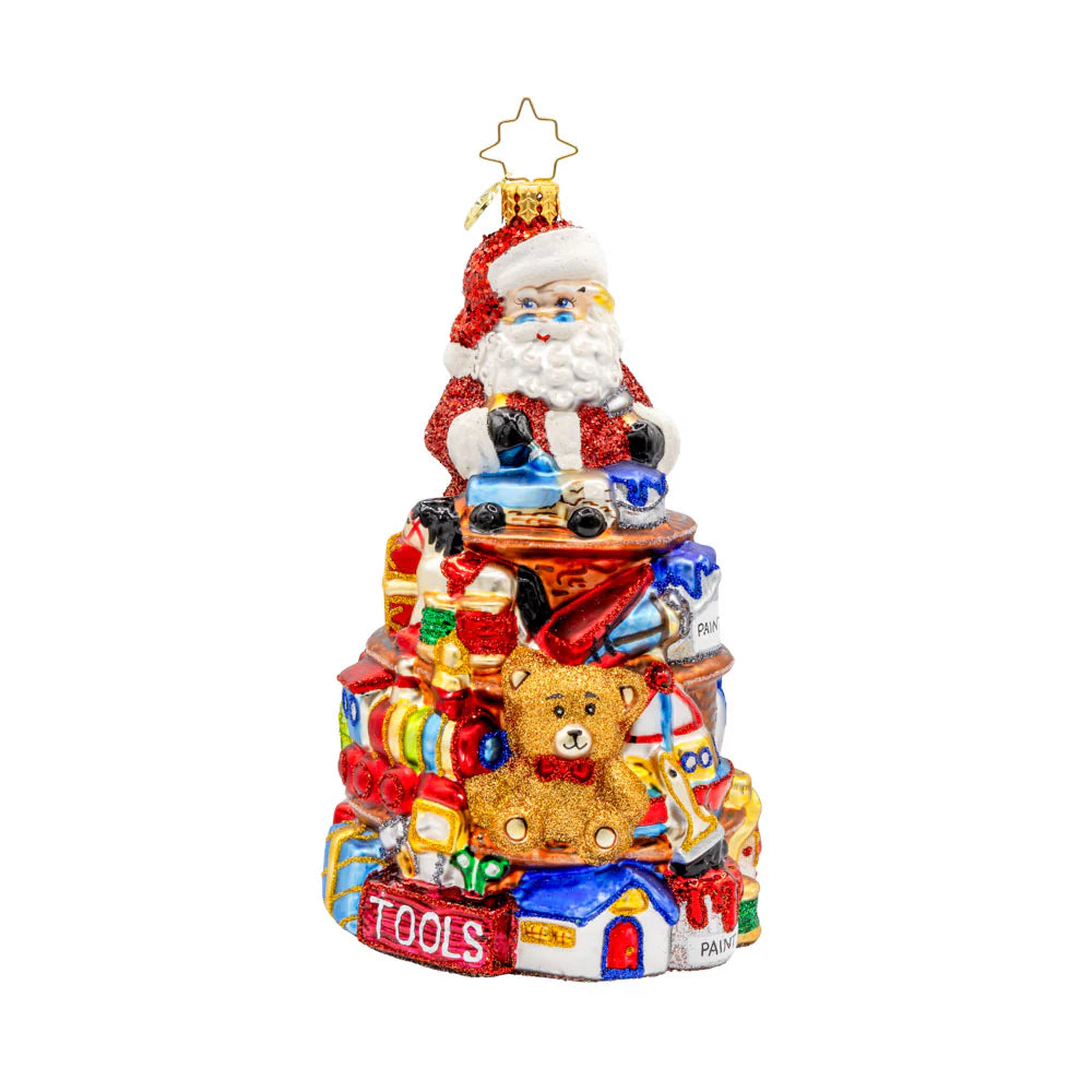 The Northpole Workshop ornament by Christopher Radko is a 2025 addition to the brand's fine European glass collection. This handcrafted ornament features Santa Claus atop a colorful stack of toys, capturing the festive spirit of the North Pole. Measuring 6 inches in height, 3.5 inches in length, and 3.75 inches in width, it stands out as a charming centerpiece in any holiday collection. Its vibrant colors and intricate details make it a delightful addition to your Christmas tree.