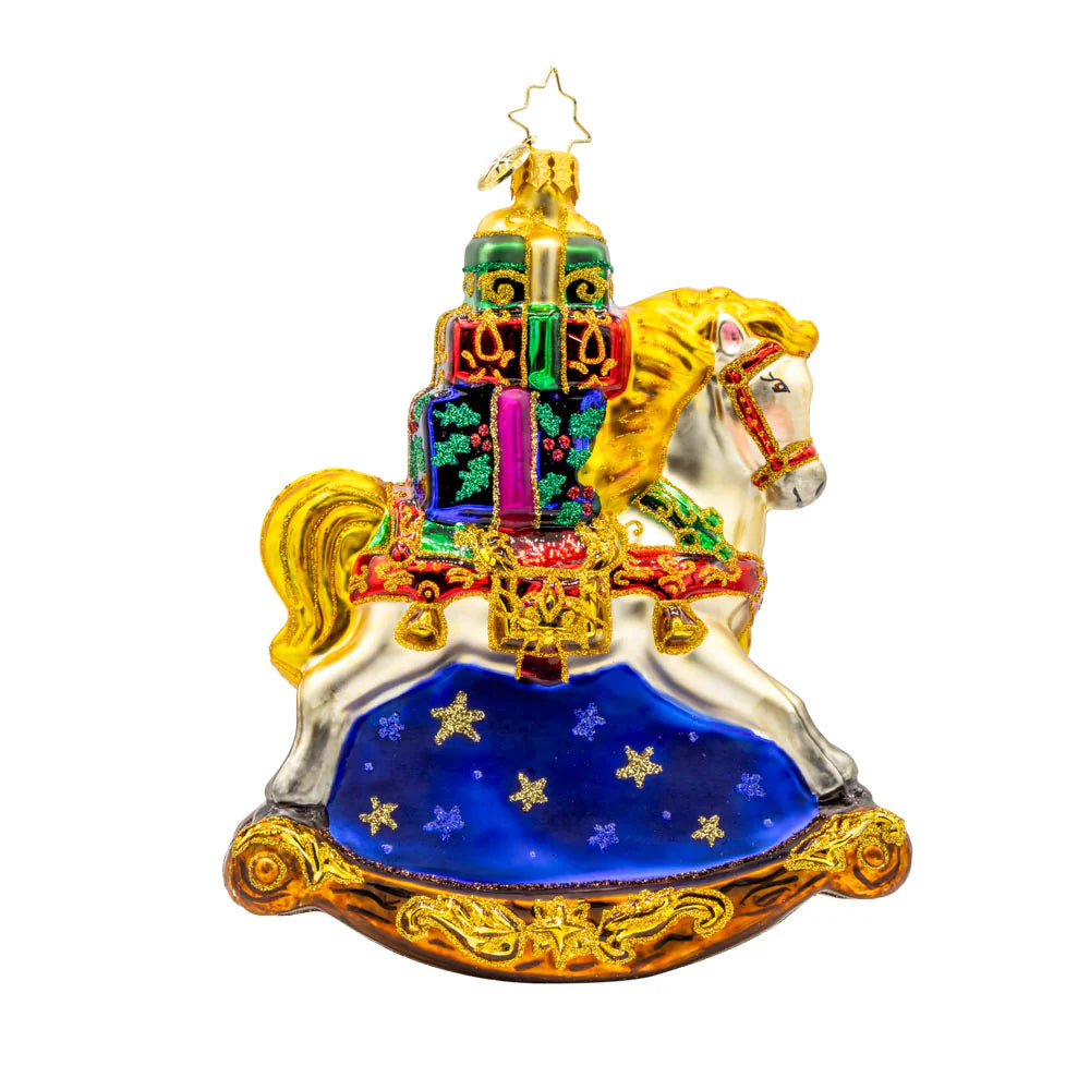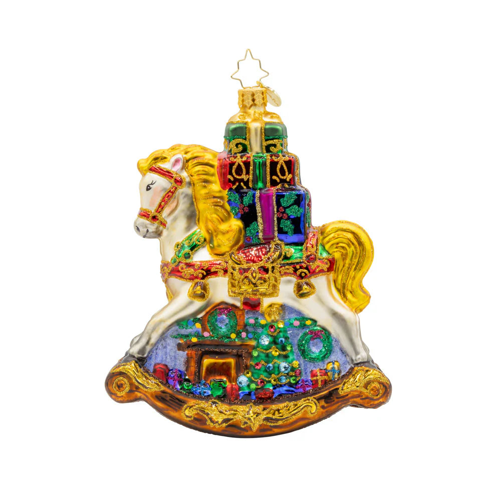 The Rockin’ Around Christmas ornament from Christopher Radko is a delightful European-crafted glass piece showcasing a vibrant rocking horse stacked with festive gifts. Hand-painted with intricate detailing, it measures 5.5 in (H) × 4.75 in (L) × 2 in (W). This whimsical ornament brings old-world charm and holiday cheer, making it a standout addition to any festive collection.