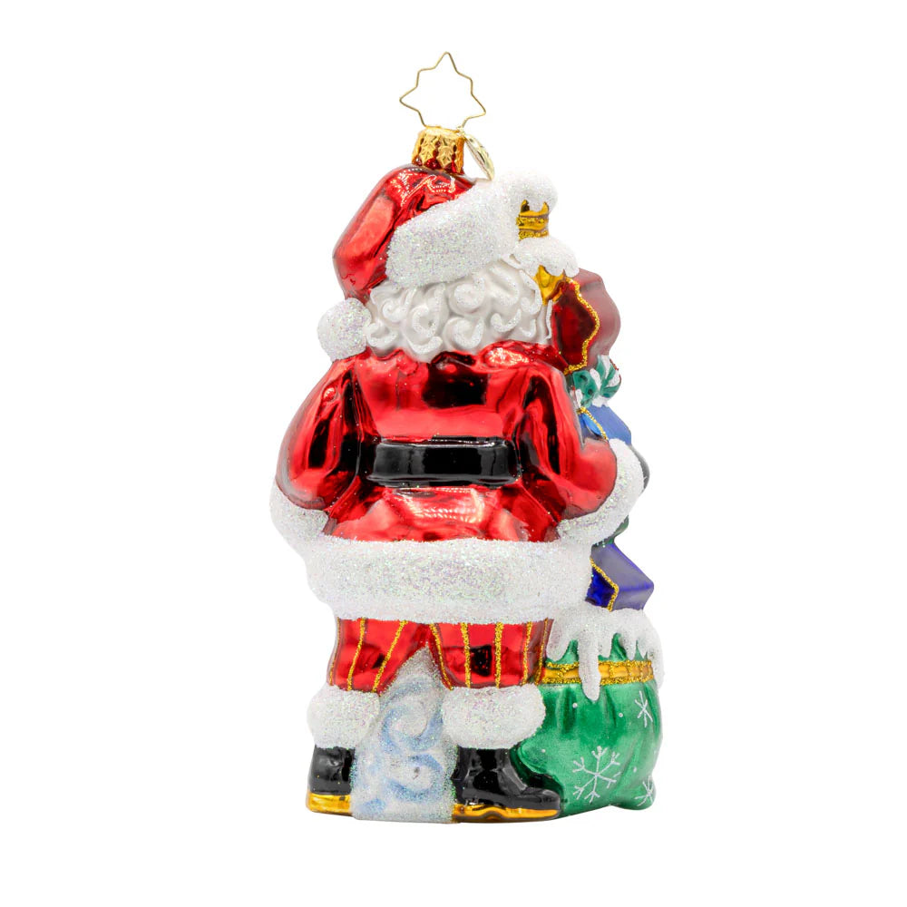 The Sign of the Seasons Santa by Christopher Radko is a charming 2025 ornament featuring Santa standing beside a festive wooden signpost pointing toward the North Pole and beyond. Expertly handcrafted in Europe from hand-blown glass, it is meticulously hand-painted with classic holiday details. Measuring 6 in (H) × 3.25 in (L) × 2 in (W), it’s a delightful addition for collectors or anyone looking to infuse their tree with nostalgic wanderlust and whimsy.
