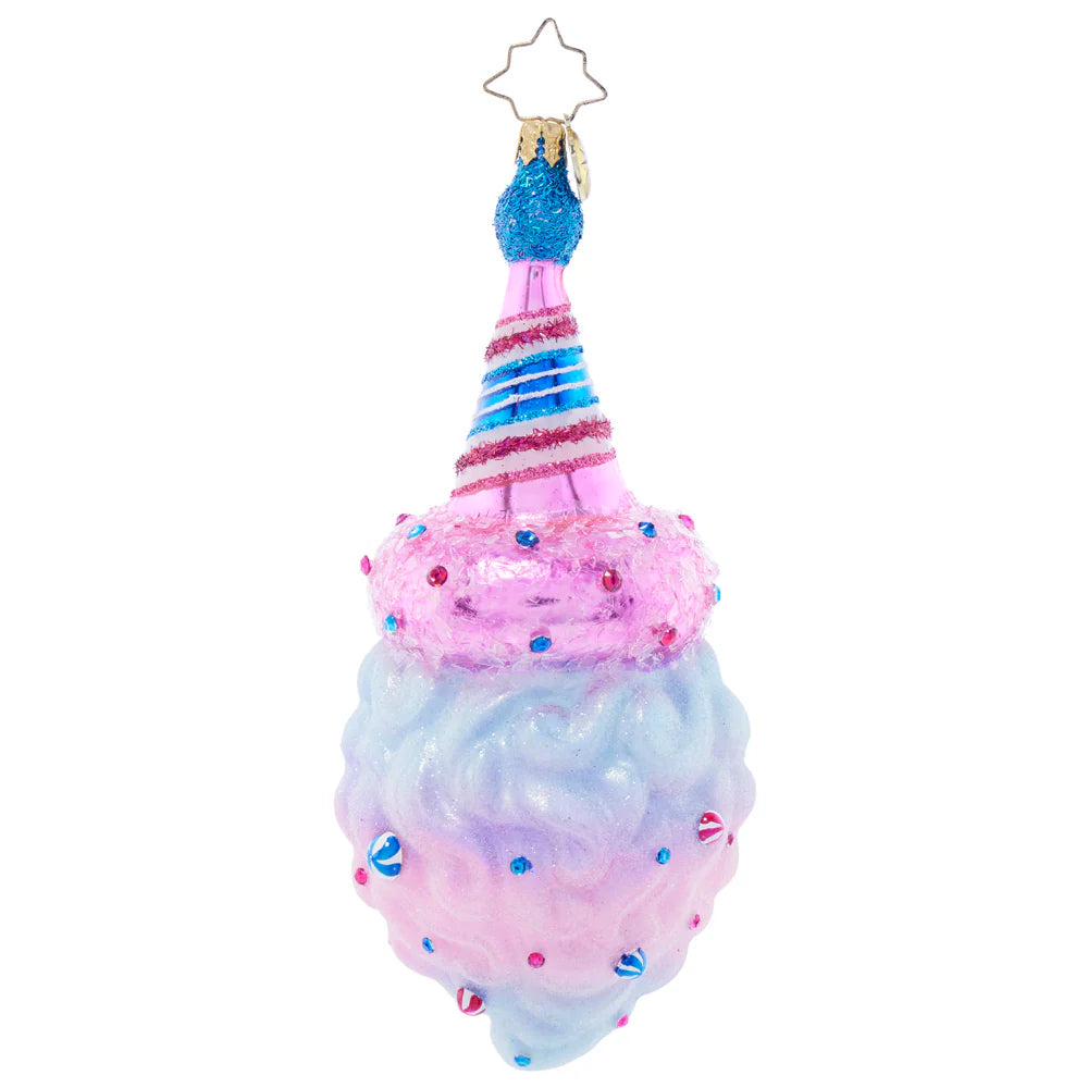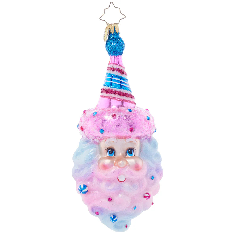 Delight in the whimsical charm of the Sugar Spun Santa ornament by Christopher Radko. This playful piece captures Santa Claus in a magical moment, with his beard and hat appearing as pastel pink and blue cotton candy swirls, adding a sweet and festive touch to your holiday décor. Handcrafted with exquisite detail, this hand-blown glass ornament brings a lighthearted, colorful sparkle to any Christmas tree.