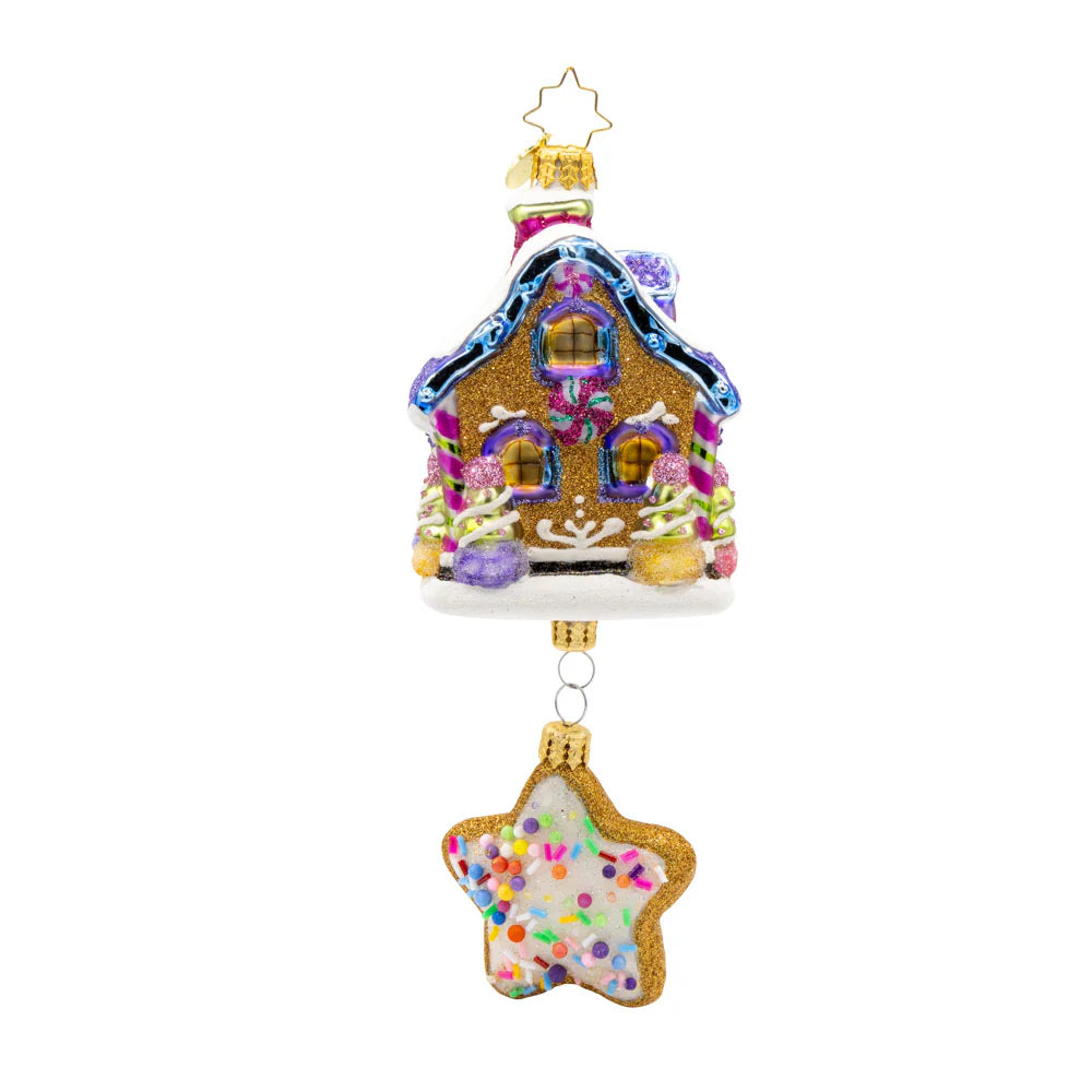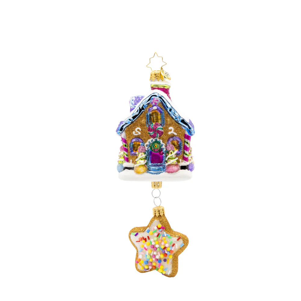The Sweet Beginnings ornament by Christopher Radko is a charming addition to the 2025 holiday collection.Handcrafted in Europe from fine glass, this ornament features a delightful gingerbread house adorned with vibrant candy details and sparkling accents. Hanging below the house is a gingerbread star cookie, adding to the festive charm. With dimensions of 7 inches in height, 2.5 inches in length, and 2 inches in width, this ornament is a sweet way to celebrate new beginnings and add a touch of whimsy to your holiday decor.