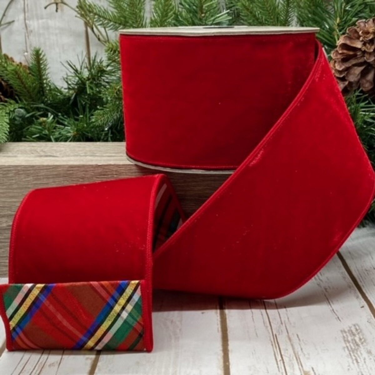 Make a bold holiday statement with this luxurious double-sided ribbon. One side features rich red velvet, while the reverse reveals a playful Nutcracker plaid that adds festive personality. Ideal for oversized bows, tree garlands, and dramatic gift wrapping. The wired edges allow for crisp, sculpted shapes that hold their form all season long.