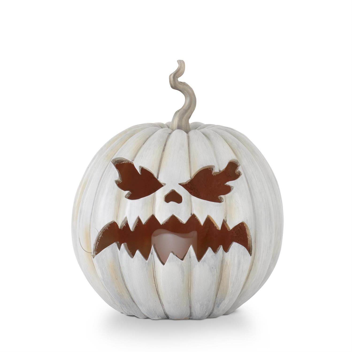 Add a modern twist to your Halloween glow with this 15.5" Gray Resin Jack-O'-Lantern, featuring a flickering LED flame for a cozy, candlelit effect. Crafted from durable resin with a carved classic face and matte white finish, it’s the perfect blend of spooky and chic. Ideal for porches, mantels, or tabletops—no carving required!