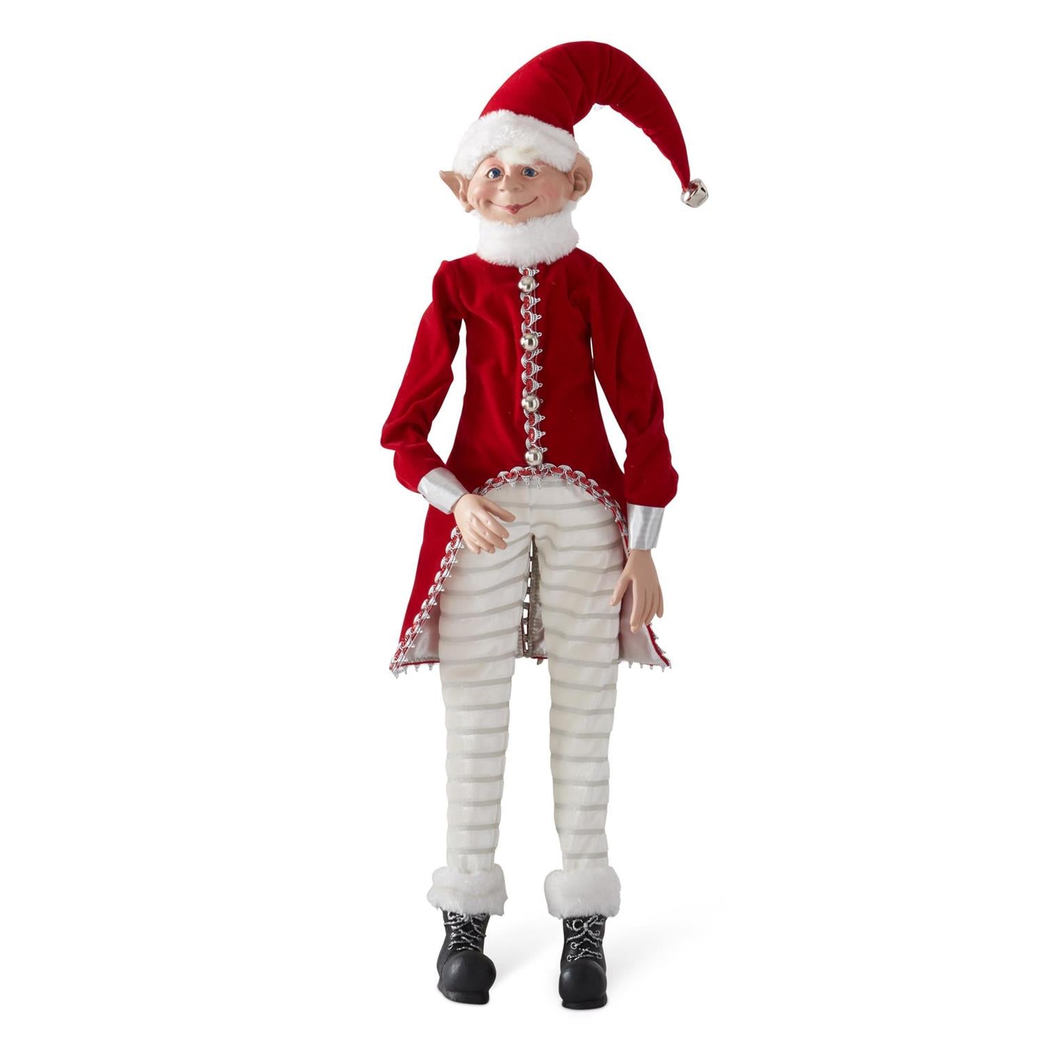 Make a bold and playful statement this season with this 42" Posable Elf with White Pants & Red Coat. Dressed in a luxurious red velvet coat trimmed with gold accents and paired with crisp white pants, this charming elf brings elegance and cheer to your holiday décor. His expressive face and fully posable body make him perfect for styling on mantels, staircases, or large tree displays.