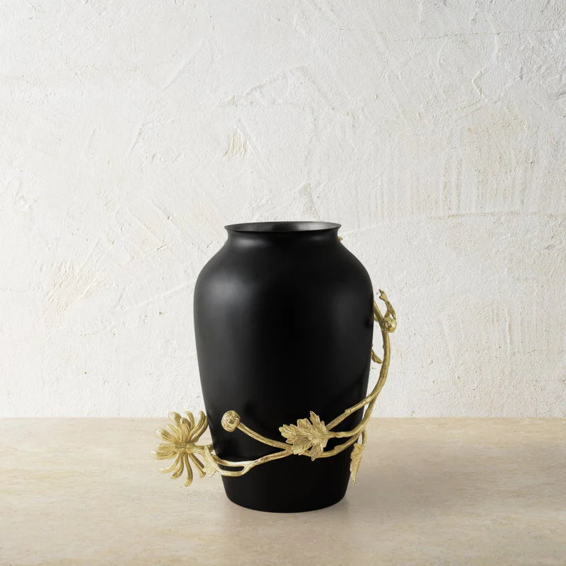 The Dahlia Vase is a striking expression of handcrafted luxury and romantic symbolism. Inspired by the Victorian tradition of gifting dahlias as tokens of love and devotion, this sculptural vase features luminous golden blooms set against a backdrop of enameled stainless steel. Each petal is meticulously crafted to reflect the natural symmetry and poetic beauty of the Golden Ratio. Mysterious, sensual, and undeniably opulent, this piece transforms floral arrangements into elevated works of art.