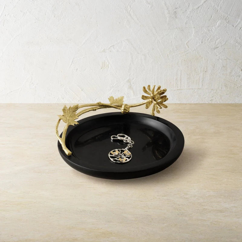 Radiant 24K gold petals bloom against black granite and enameled stainless steel, creating a dramatic contrast of opulence. Inspired by the Victorian tradition of gifting dahlias as tokens of love, this piece transforms your vanity or tabletop into a scene of refined beauty.