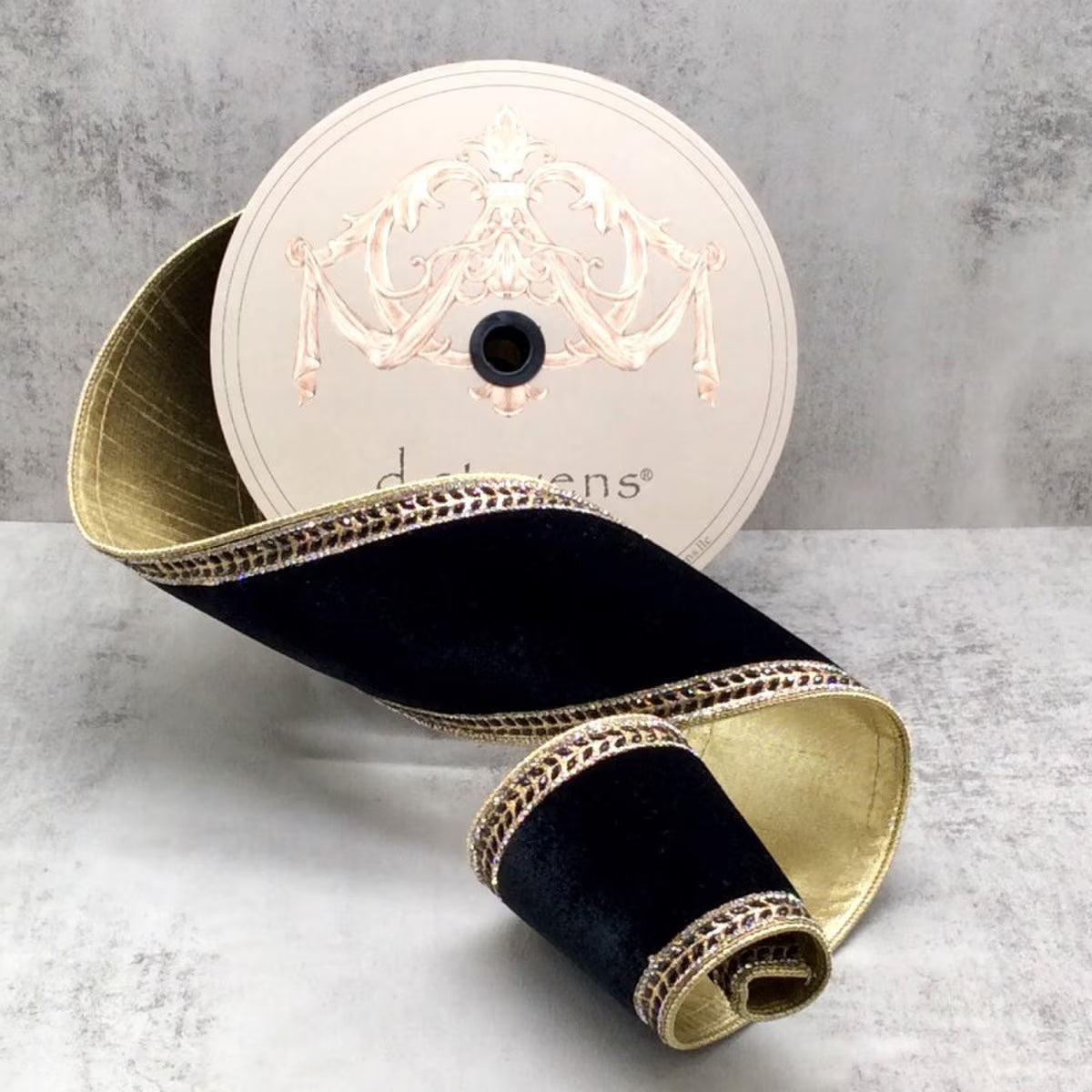 Elegant and eye-catching, this Black Velvet Ribbon is the ultimate in luxe holiday detail. A rich black velvet base is edged with a sparkling side trim of black and gold crystals, creating a dramatic contrast that adds sophistication to wreaths, tree décor, gift wrapping, and tablescapes.