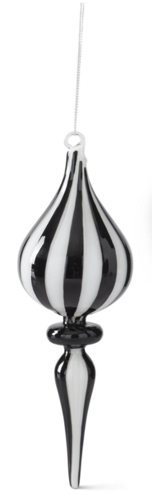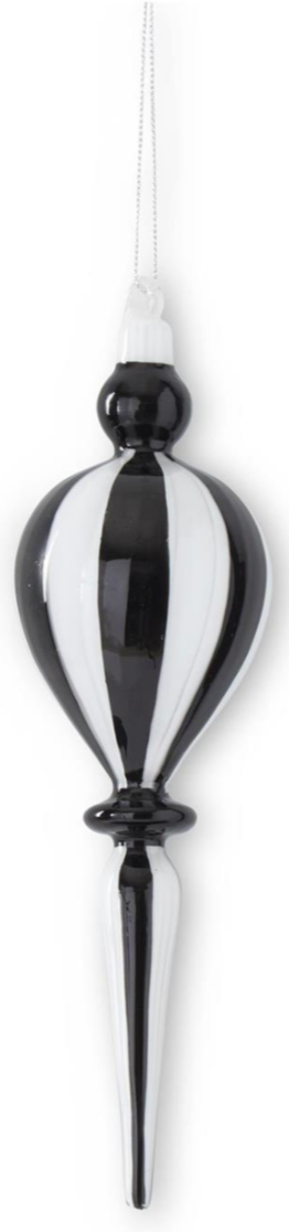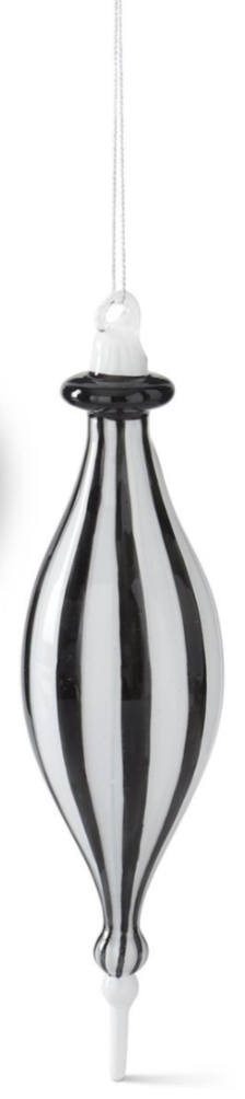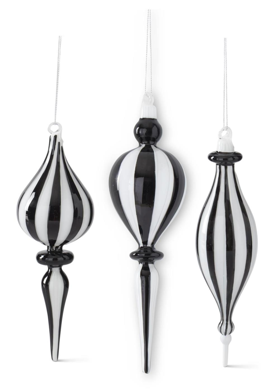 Add chic contrast and timeless elegance to your holiday décor with these Black & White Striped Glass Finial Ornaments. Crafted from glass with bold striping, each ornament features a refined silhouette and glossy finish that catches the light beautifully. Available in three distinct shapes, these ornaments are sold separately—perfect for mixing, matching, and creating a sophisticated holiday look.