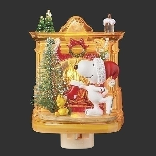 Celebrate the holidays with this cozy Fireplace Snoopy Nightlight. Standing 5.5" tall, it features Snoopy nestled by a festive fireplace, complete with holiday stockings and glowing warmth. A flicker flame bulb inside the fireplace creates a realistic, inviting glow that brings the scene to life.