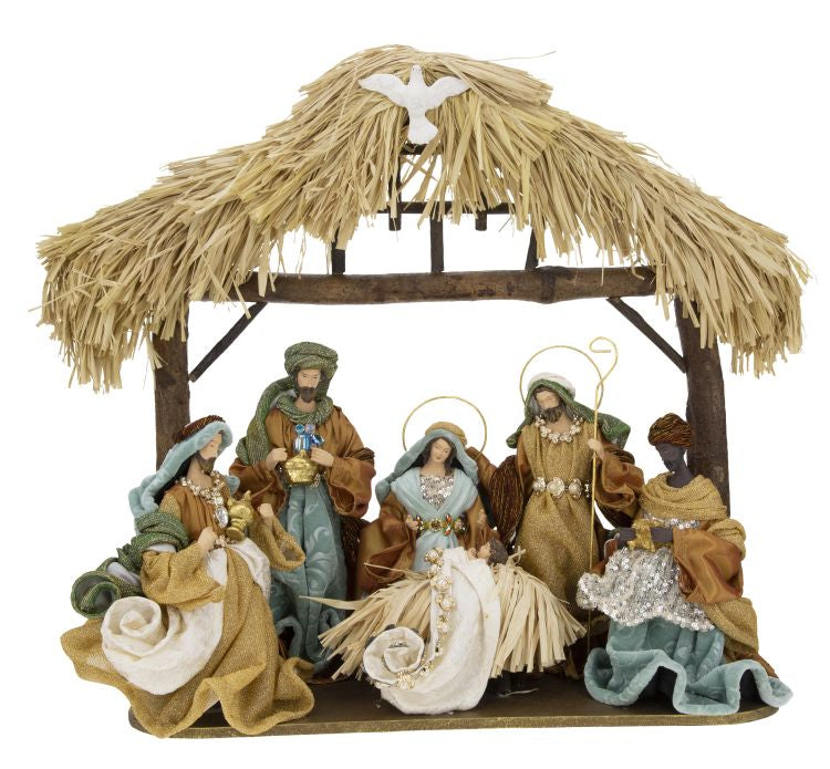 The stable spans 25″ wide and showcases a rustic rafia roof, adding authentic texture and charm to the scene. Expertly crafted with Mark Roberts’ signature artistry, this nativity set combines rich materials and exquisite craftsmanship for a captivating centerpiece.