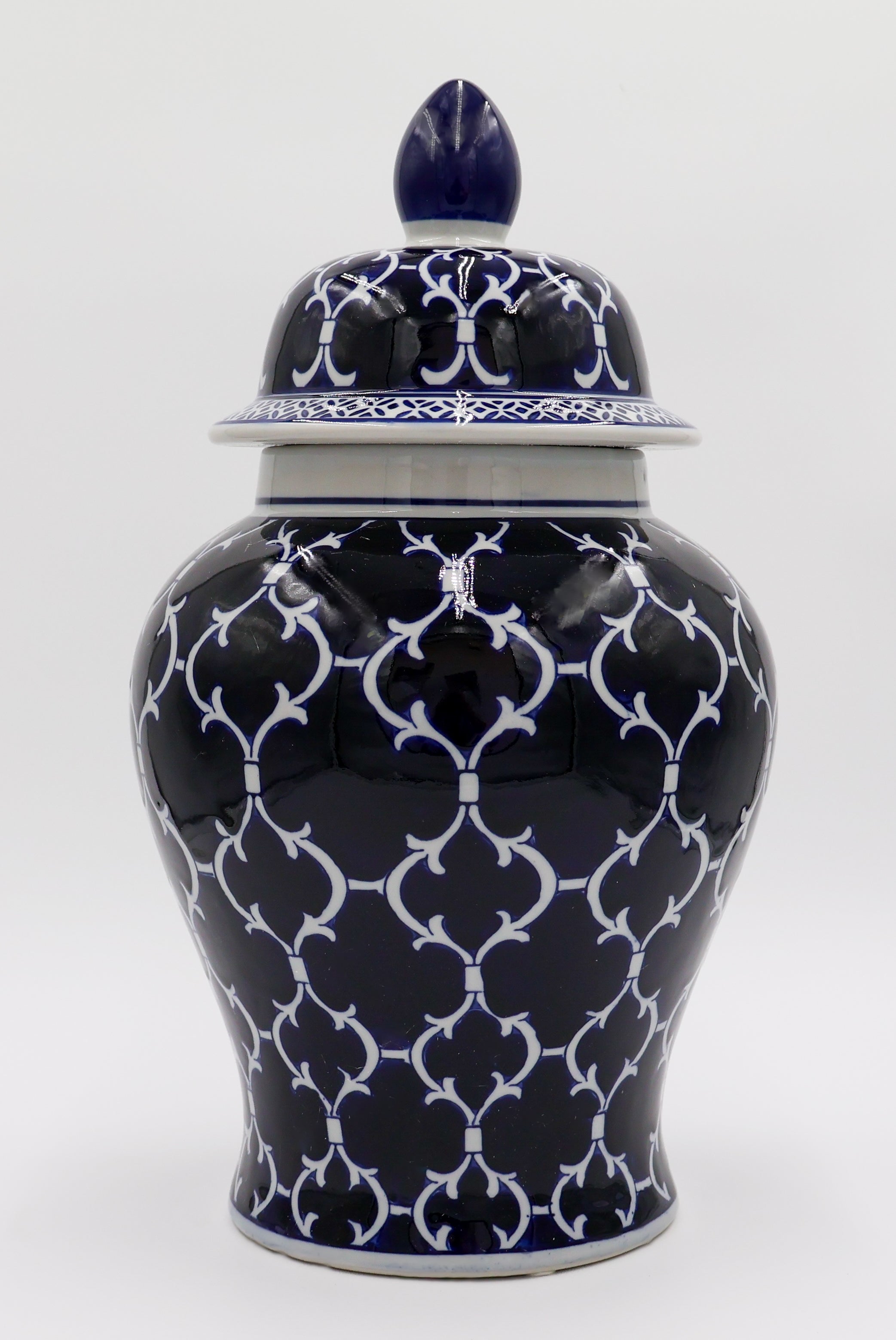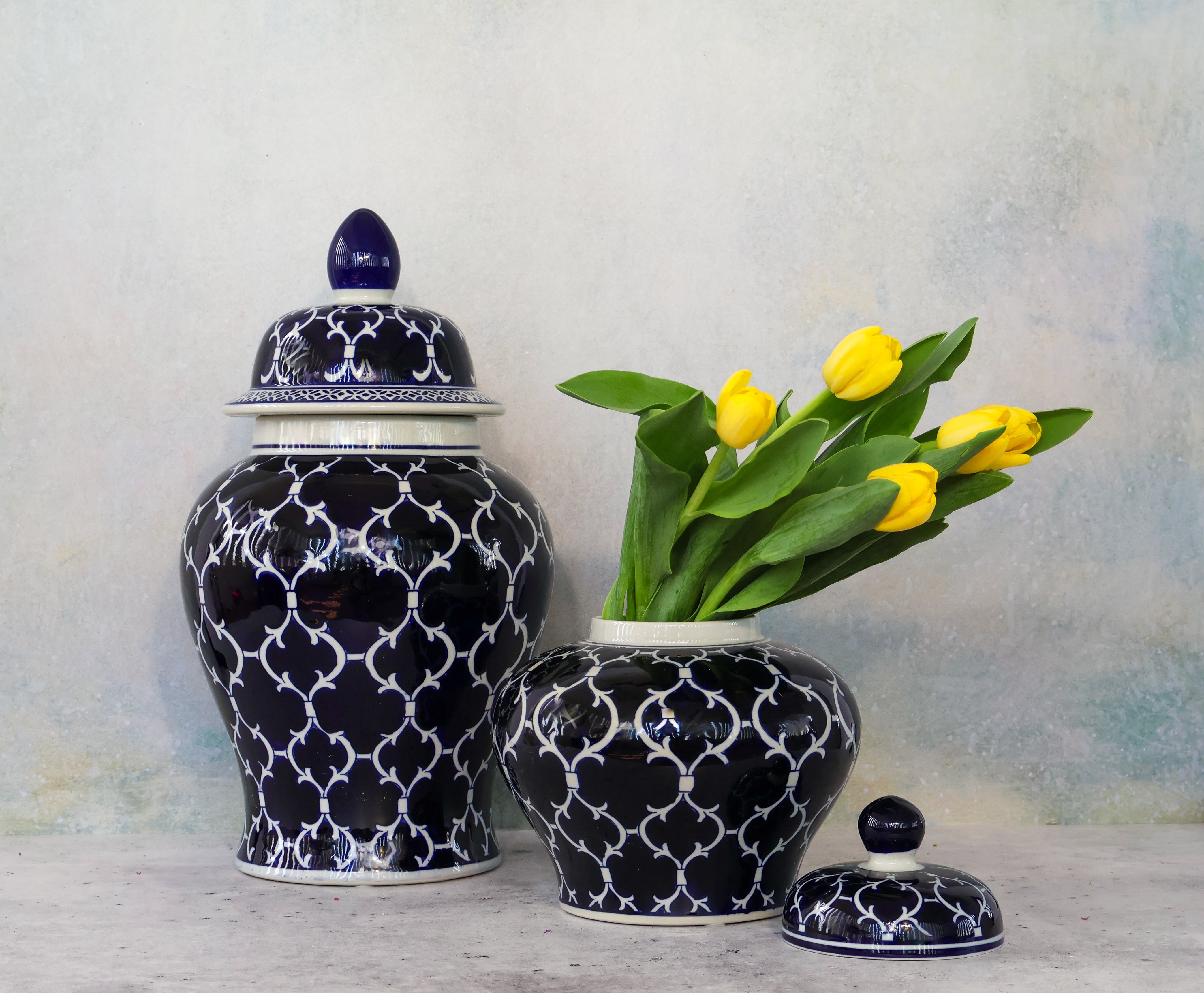 Crafted with meticulous attention to detail, our Blue & White Quatrefoil Lidded Ceramic Vase is a testament to quality craftsmanship. The ceramic construction ensures durability, while the carefully applied glaze enhances the richness of the blue and white tones, creating a visual masterpiece that stands out in any setting.