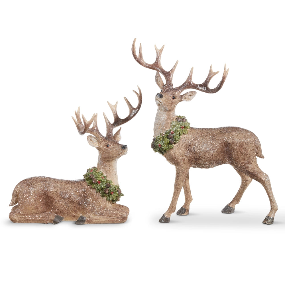 Elegant and timeless, this Set of 2 Glittered Deer with Wreaths brings refined sparkle to any holiday display. Each 19.5" deer features a graceful silhouette dusted in shimmering glitter and adorned with a lush greenery wreath accented by berries. Perfect for mantels, sideboards, or beneath the tree, these coordinating figures add sophistication and festive charm to your seasonal décor.