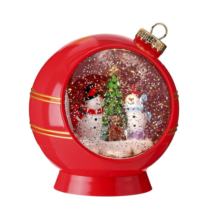 Design: Red ornament-shaped globe featuring snowmen surrounded by swirling glitter