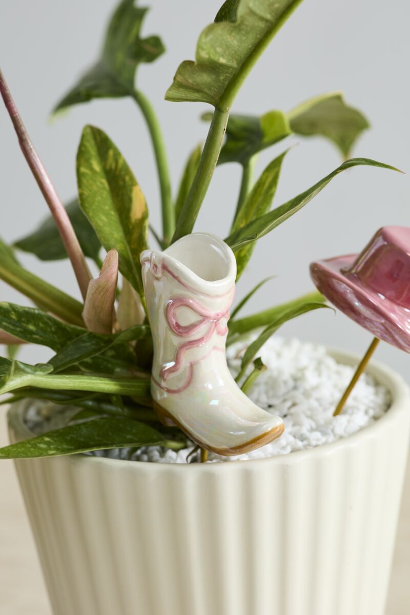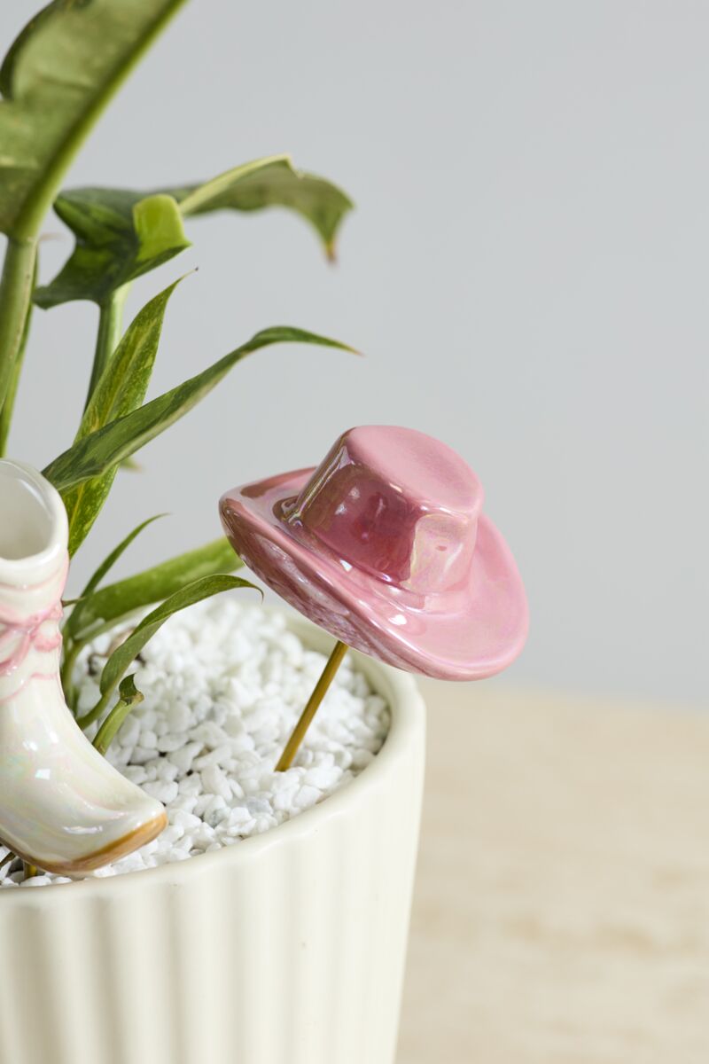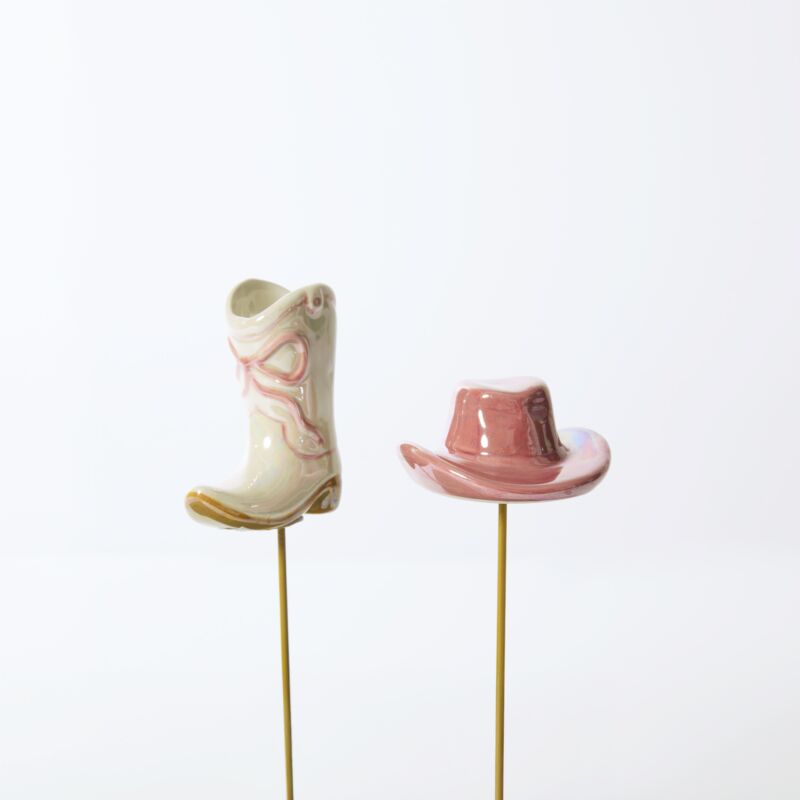 Get on the western bandwagon with the charming Giddy Up Plant Sticks! This playful ceramic set features a pink iridescent cowgirl hat and a glossy white boot finished with a sweet pink bow—perfectly capturing the fun, on-trend western aesthetic.