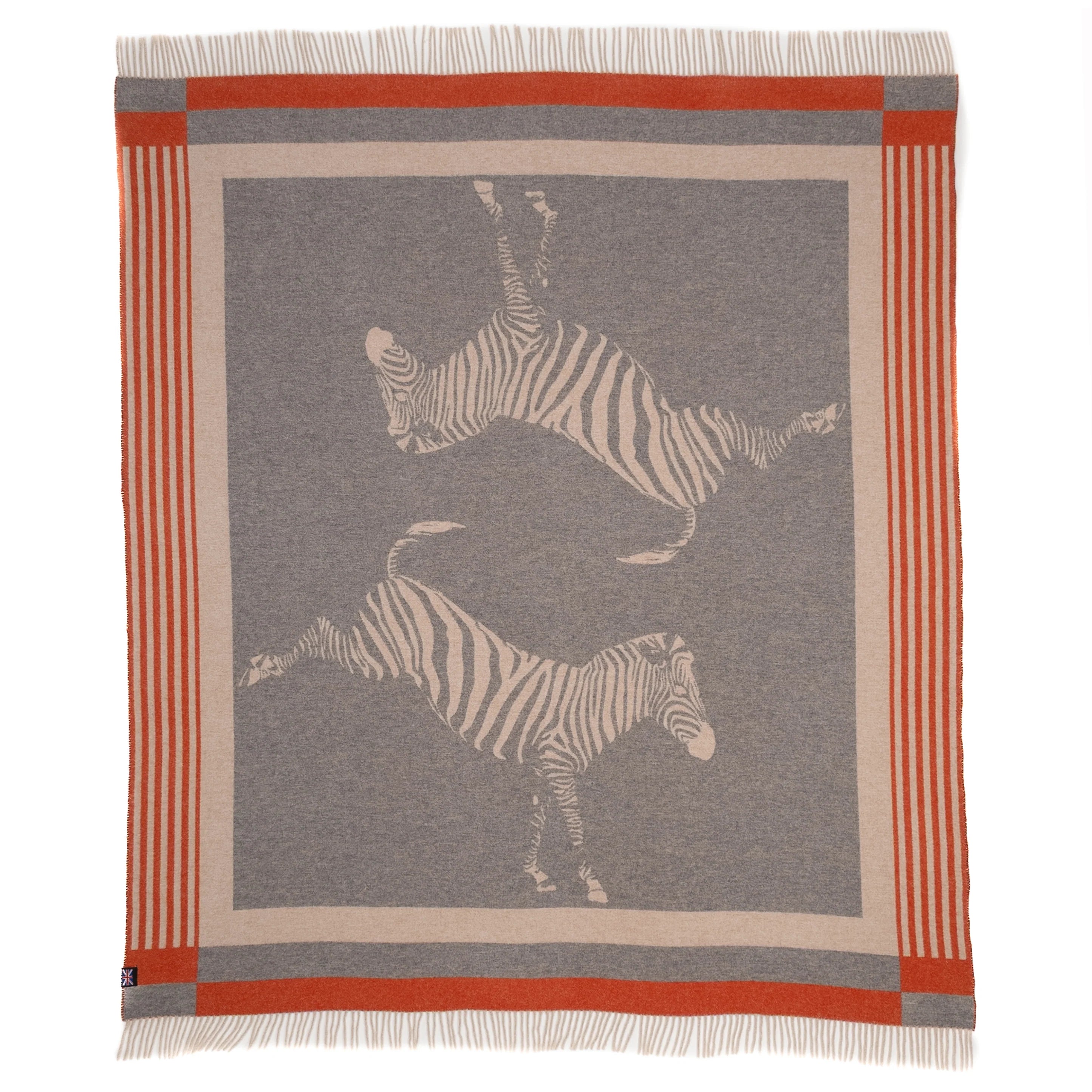 On one side, a dramatic charcoal grey field sets the stage for mirrored ivory zebras and rich orange detailing; on the reverse, the pattern inverts to reveal a softer, more understated interpretation—offering two distinct moods in one artful textile.